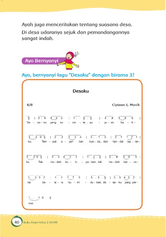 Ayah juga menceritakan tentang suasana desa. Di desa udaranya sejuk dan pemandangannya sangat indah. Ayo Bernyanyii y Ayo, bernyanyi lagu “Desaku” dengan birama 3! 40 Buku Siswa Kelas 2 SD/MI