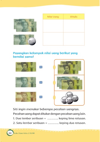2. Satu lembar seribuan = .............. keping dua ratusan.