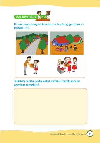 Ayo Berdiskusisi Diskusikan dengan temanmu tentang gambar di bawah ini! Tulislah cerita pada kotak berikut berdasarkan gambar tersebut! Subtema 3: Tugasku sebagai Umat Beragama 85