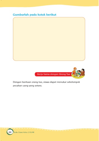 Gambarlah pada kotak berikut Kerja Sama dengan Orang Tua Dengan bantuan orang tua, siswa dapat menukar sekelompok pecahan uang yang setara. 88 Buku Siswa Kelas 2 SD/MI