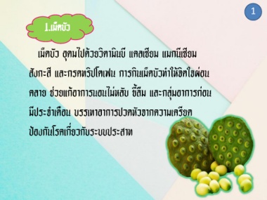 1 1.เม็ดบัว เม็ดบัว อุดมไปด้วยวิตามินบี แคลเซียม แมกนีเซียม สังกะสี และกรดทริปโตเฟน การกินเม็ดบัวท าให้จิตใจผ่อน คลาย ช่วยแก้อาการนอนไม่หลับ ขี้ลืม และกลุ่มอาการก่อน มีประจ าเดือน บรรเทาอาการปวดหัวจากความเครียด ป้องกันโรคเกี่ยวกับระบบประสาท 3