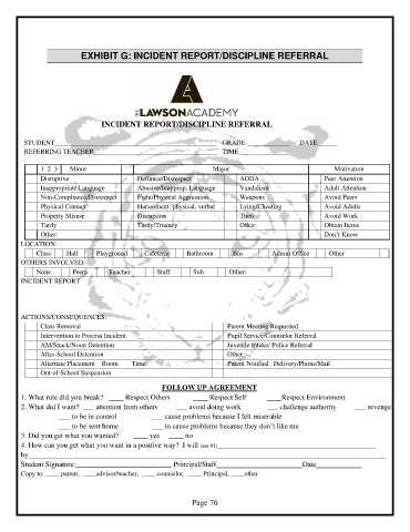 EXHIBIT G: INCIDENT REPORT/DISCIPLINE REFERRAL