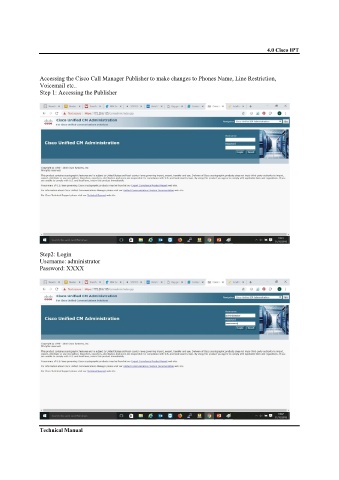 4.0 Cisco IPT Accessing the Cisco Call Manager Publisher to make changes to Phones Name, Line Restriction, Voicemail etc.. Step 1: Accessing the Publisher Step2: Login Username: administrator Password: XXXX Technical Manual