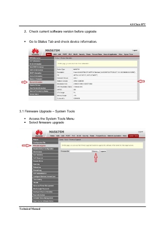 4.0 Cisco IPT 2. Check current software version before upgrade Go to Status Tab and check device information. 3.1 Firmware Upgrade – System Tools Access the System Tools Menu Select firmware upgrade Technical Manual