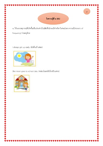 9 5 ใบความรู้ที่ 2 (ต่อ) 9 3. ใช้บอกเหตุการณ์ที่เกิดขึ้นเป็นประจ าเป็นนิสัยซึ่งมักจะมีค ากริยาวิเศษณ์บอก ความถี่(Adverb of frequency) ร่วมอยู่ด้วย I always get up early. (ฉันตื่นเช้าเสมอ) She never goes to school late. (หล่อนไมเคยไปโรงเรียนสาย)
