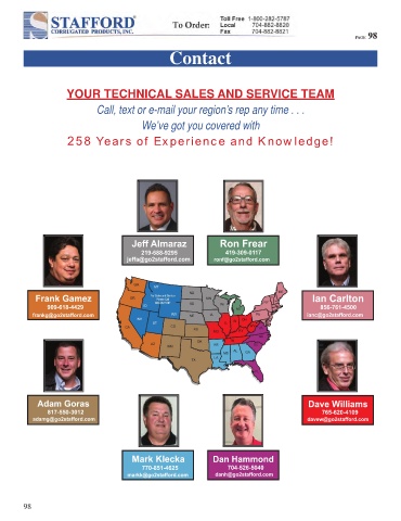 PAGE 98 Contact YOUR TECHNICAL SALES AND SERVICE TEAM Call, text or e-mail your region’s rep any time . . . We’ve got you covered with 258 Years of Experience and Knowledge! 98