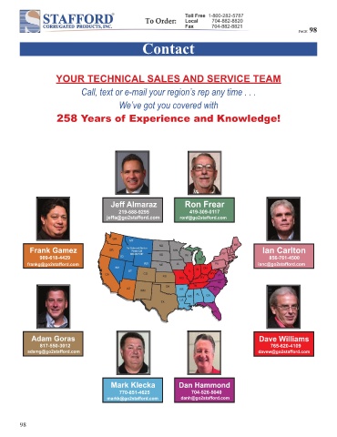 PAGE 98 Contact YOUR TECHNICAL SALES AND SERVICE TEAM Call, text or e-mail your region’s rep any time . . . We’ve got you covered with 258 Years of Experience and Knowledge! 98
