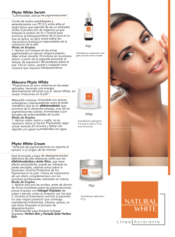 Está formulada a base de despigmentantes selectivos de alta tolerancia como son los álfahidroxiácidos y ácido fítico, que tiene efecto antioxidante, puede ser utilizado en pieles sencibles, además actúa sobre la tirosinase ( Enzima Protectora de los Pigmentos en la piel). Crema de tratamiento de uso diario complementario con los procesos profesionales realizados en cabina. Modo de Empleo