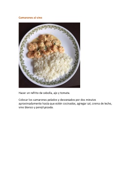 Camarones al vino Hacer un refrito de cebolla, ajo y tomate. Colocar los camarones pelados y desvenados por dos minutos aproximadamente hasta que estén cocinados, agregar sal, crema de leche, vino blanco y perejil picado.