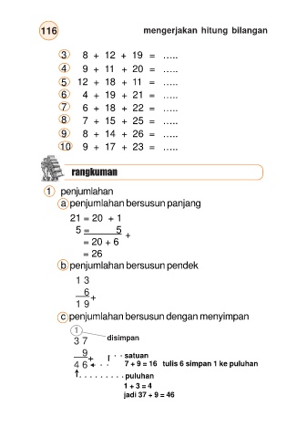 4 6 ○ ○ ○ 7 + 9 = 16 tulis 6 simpan 1 ke puluhan