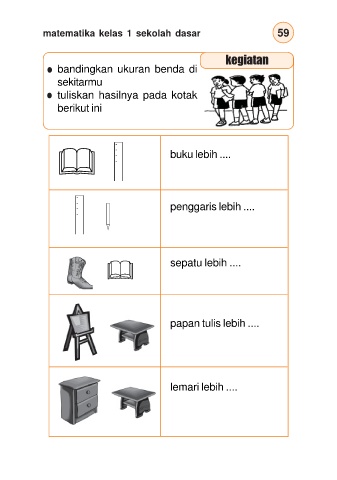 matematika kelas 1 sekolah dasar 59 kegiatan bandingkan ukuran benda di sekitarmu tuliskan hasilnya pada kotak berikut ini buku lebih .... penggaris lebih .... sepatu lebih .... papan tulis lebih .... lemari lebih ....