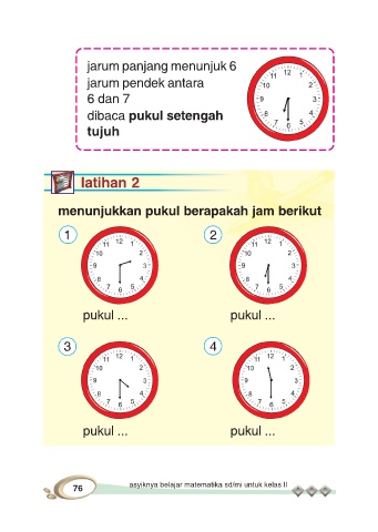 jarum panjang menunjuk 6 jarum pendek antara 6 dan 7 dibaca pukul setengah tujuh latihan 2 menunjukkan pukul berapakah jam berikut 1 2 pukul ... pukul ... 3 4 pukul ... pukul ... 76 asyiknya belajar matematika sd/mi untuk kelas II
