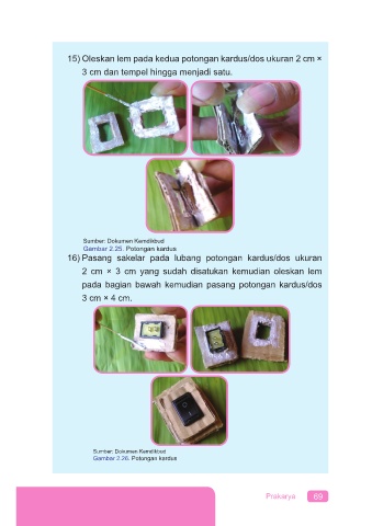 15) Oleskan lem pada kedua potongan kardus/dos ukuran 2 cm ×