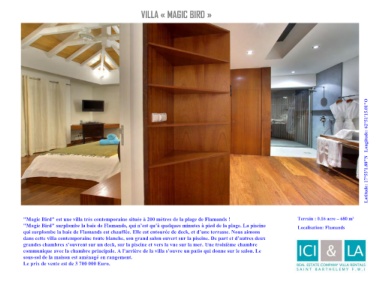 "Magic Bird" est une villa très contemporaine située à 200 mètres de la plage de Flamands ! Terrain : 0.16 acre – 680 m²