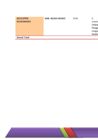 2019 KPPN KAB. MUKO-MUKO FISIK E- 6139 104 22,759,237,750 MUKOMUKO catalog/purchasing Lelang 1997.89 44 65,333,461,000 Pengadaan 197 63 1,805,103,650 Langsung Swakelola 1062 69 11,963,745,651 Grand Total 81651.22256 3426 1,169,582,310,374