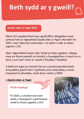 Mae’r digwyddiad Gwylio Adar hefyd yn helpu ysgolion i ddysgu eraill. Mae’r wers yn anelu at annog disgyblion i gynllunio ar gyfer