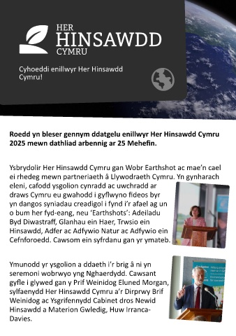 Hinsawdd, Adfer ac Adfywio Natur ac Adfywio ein Ewch i Her Hinsawdd Cymru i wylio’r ysgolion a gyrhaeddodd y