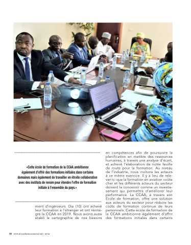«Cette école de formation de la CCAA ambitionne également d’offrir des formations initiales dans certains domaines mais également de travailler en étroite collaboration avec des instituts de renom pour étendre l’offre de formation initiale à l’ensemble du pays.» ment d’ingénieurs. Dix (10) ont achevé leur formation à l’étranger et ont réinté- gré la CCAA en 2019. Nous avons aussi établi la cartographie de nos besoins en compétences afin de poursuivre la planification en matière des ressources humaines, à travers une analyse d’écart, et achevé l’élaboration de notre feuille de route pour la formation. Au niveau de l’industrie, nous invitons les acteurs à ce même exercice. Il y a lieu de rele- ver ici que la formation en aviation coûte cher et les différents acteurs du secteur doivent la concevoir comme un investis- sement qui permettra d’améliorer leur performance. La CCAA, à travers son Ecole de formation, offre une solution aux acteurs du secteur pour réduire les coûts de formation continue de leurs personnels. Cette école de formation de la CCAA ambitionne également d’offrir des formations initiales dans certains 50 www.africanbusinessjournal.info • n°32