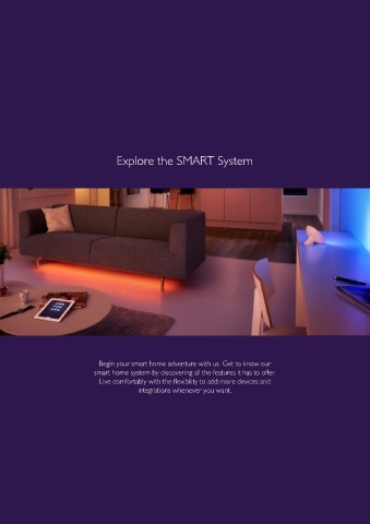 Explore the SMART System Begin your smart home adventure with us. Get to know our smart home system by discovering all the features it has to offer. Live comfortably with the exibility to add more devices and integrations whenever you want.