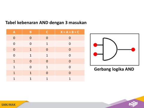 Tabel kebenaran AND dengan 3 masukan A B C X = A + B + C 0 0 0 0 0 0 1 0 0 1 0 0 0 1 1 0 1 0 0 0 1 0 1 0 Gerbang logika AND 1 1 0 0 1 1 1 1