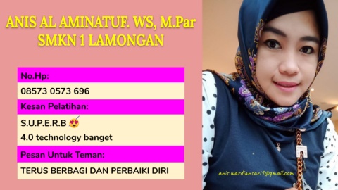 No.Hp: 08573 0573 696 Kesan Pelatihan: S.U.P.E.R.B 4.0 technology banget Pesan Untuk Teman: TERUS BERBAGI DAN PERBAIKI DIRI anis.wardiansari1@gmail.com