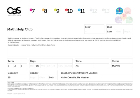 Some activities such as Baking is provided by an external organization. This will incur an extra cost outside of the CAS fee. For fee-based activities enrolment is for the full year unless otherwise specified. Students have a grace period to withdraw from the activity during the sign up Some activities such as Baking is provided by an external organization. This will incur an extra cost outside of the CAS fee. For fee-based activities enrolment is for the full year unless otherwise specified. Students have a grace period to withdraw from the activity during the sign up