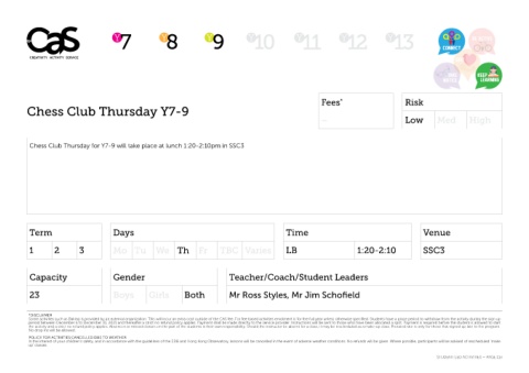Some activities such as Baking is provided by an external organization. This will incur an extra cost outside of the CAS fee. For fee-based activities enrolment is for the full year unless otherwise specified. Students have a grace period to withdraw from the activity during the sign up Some activities such as Baking is provided by an external organization. This will incur an extra cost outside of the CAS fee. For fee-based activities enrolment is for the full year unless otherwise specified. Students have a grace period to withdraw from the activity during the sign up