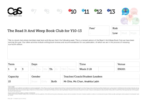 Some activities such as Baking is provided by an external organization. This will incur an extra cost outside of the CAS fee. For fee-based activities enrolment is for the full year unless otherwise specified. Students have a grace period to withdraw from the activity during the sign up Some activities such as Baking is provided by an external organization. This will incur an extra cost outside of the CAS fee. For fee-based activities enrolment is for the full year unless otherwise specified. Students have a grace period to withdraw from the activity during the sign up