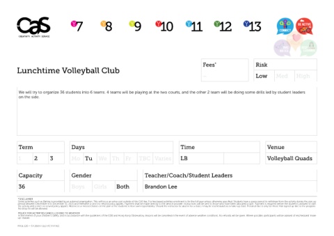 Some activities such as Baking is provided by an external organization. This will incur an extra cost outside of the CAS fee. For fee-based activities enrolment is for the full year unless otherwise specified. Students have a grace period to withdraw from the activity during the sign up Some activities such as Baking is provided by an external organization. This will incur an extra cost outside of the CAS fee. For fee-based activities enrolment is for the full year unless otherwise specified. Students have a grace period to withdraw from the activity during the sign up