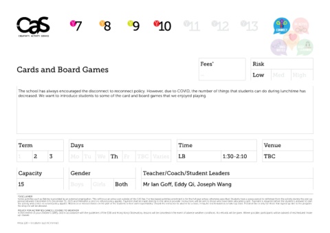 Some activities such as Baking is provided by an external organization. This will incur an extra cost outside of the CAS fee. For fee-based activities enrolment is for the full year unless otherwise specified. Students have a grace period to withdraw from the activity during the sign up Some activities such as Baking is provided by an external organization. This will incur an extra cost outside of the CAS fee. For fee-based activities enrolment is for the full year unless otherwise specified. Students have a grace period to withdraw from the activity during the sign up