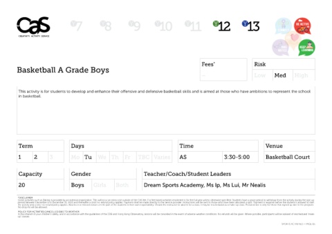 Training is at KJS. This activity is for students to develop and enhance their offensive and defensive basketball skills and is aimed at those who have ambitions to represent the school
