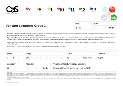 Some activities such as Baking is provided by an external organization. This will incur an extra cost outside of the CAS fee. For fee-based activities enrolment is for the full year unless otherwise specified. Students have a grace period to withdraw from the activity during the sign up Some activities such as Baking is provided by an external organization. This will incur an extra cost outside of the CAS fee. For fee-based activities enrolment is for the full year unless otherwise specified. Students have a grace period to withdraw from the activity during the sign up