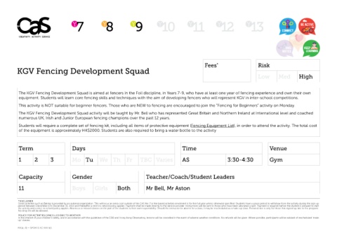 equipment. Students will learn core fencing skills and techniques with the aim of developing fencers who will represent KGV in inter-school competitions.