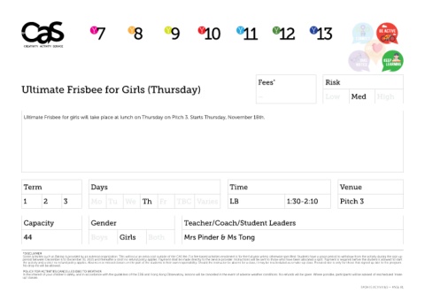 Ultimate Frisbee for boys will take place at lunch on Wednesday on Pitch 1. Starts Wednesday, November 17th. Ultimate Frisbee for girls will take place at lunch on Thursday on Pitch 3. Starts Thursday, November 18th.