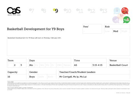 Some activities such as Baking is provided by an external organization. This will incur an extra cost outside of the CAS fee. For fee-based activities enrolment is for the full year unless otherwise specified. Students have a grace period to withdraw from the activity during the sign up Some activities such as Baking is provided by an external organization. This will incur an extra cost outside of the CAS fee. For fee-based activities enrolment is for the full year unless otherwise specified. Students have a grace period to withdraw from the activity during the sign up