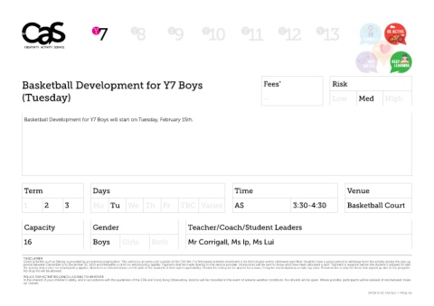 Some activities such as Baking is provided by an external organization. This will incur an extra cost outside of the CAS fee. For fee-based activities enrolment is for the full year unless otherwise specified. Students have a grace period to withdraw from the activity during the sign up Some activities such as Baking is provided by an external organization. This will incur an extra cost outside of the CAS fee. For fee-based activities enrolment is for the full year unless otherwise specified. Students have a grace period to withdraw from the activity during the sign up