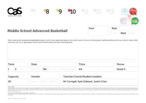 Some activities such as Baking is provided by an external organization. This will incur an extra cost outside of the CAS fee. For fee-based activities enrolment is for the full year unless otherwise specified. Students have a grace period to withdraw from the activity during the sign up Some activities such as Baking is provided by an external organization. This will incur an extra cost outside of the CAS fee. For fee-based activities enrolment is for the full year unless otherwise specified. Students have a grace period to withdraw from the activity during the sign up