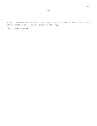 1691 1944 A long tiresome interview with Mrs Sawaf headmistress of Mhq Girls school who threatened to leave unless given more pay. TTs & Gunns came in.
