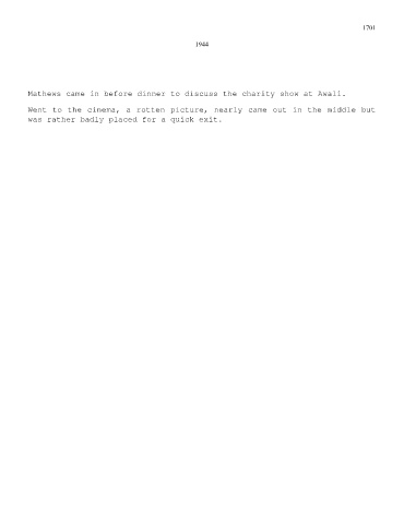 1701 1944 Mathews came in before dinner to discuss the charity show at Awali. Went to the cinema, a rotten picture, nearly came out in the middle but was rather badly placed for a quick exit.