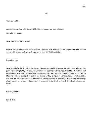 declared war on England & asking if he should arrest all Iraqis. Very reluctantly left Jidda & returned to