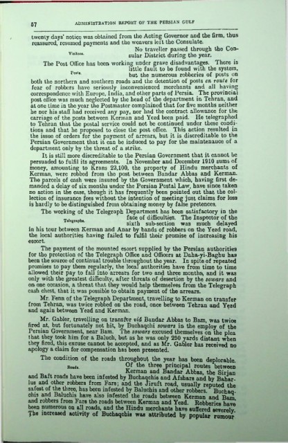 Kerman, were robbed from the post between Bandar Abbas and Kerman.
