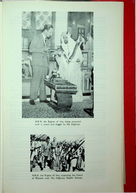 * jyz as • : : H.R.H. the Regent of Iraq being presented with a sword and dagger by His Highness. H.R.H. the Regent of Iraq inspecting the Guard of Honour with His Highness Shaikh Sulman.