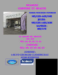 NUANCES COIFFURE ET BEAUTE MARDI-MERCREDI-VENDREDI 9H/12H-14H/19H JEUDI : 9H/12H-14H/20H SAMEDI : 8H/17H LE SALON DE BEAUTE sur rdv TEL: 06 45 55 73 47 COIFFURE TEL: 03 23 59 06 57 ADRESSE : 4 BLVD GEORGES CLEMENCEAU 02200 SOISSONS