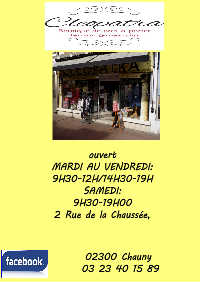 ouvert MARDI AU VENDREDI: 9H30-12H/14H30-19H SAMEDI: 9H30-19H00 2 Rue de la Chaussée, 02300 Chauny 03 23 40 15 89