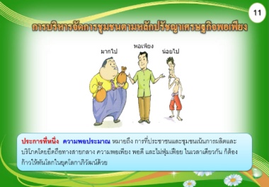 11 ประการที่หนึ่ง ความพอประมาณ หมายถึง การที่ประชาชนและชุมชนเน้นการผลิตและ บริโภคโดยยึดถือทางสายกลาง ความพอเพียง พอดี และไม่ฟุ่มเฟือย ในเวลาเดียวกัน ก็ต้อง ก้าวให้ทันโลกในยุคโลกาภิวัฒน์ด้วย