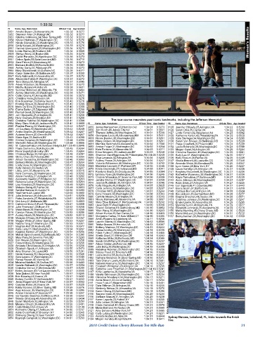 2983 Christine Fletcher,38,Washington,DC 1:33:41 0.5389 The race course meanders past iconic landmarks, including the Jefferson Memorial.