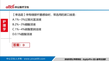 【单选题】伴有绿脓杆菌感染时,常选用的漱口液是: A.1%~3%过氧化氢溶液 护 理 B.2%~3%硼酸溶液 学 C.1%~4%碳酸氢钠溶液 D.0.1%醋酸溶液 答案:D 添加东营公考君微信:dygkjoffcn 进入备考交流群