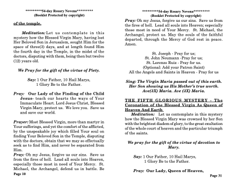 of the temple Meditation:Let us contemplate in in in this mystery how the the Blessed Virgin Mary having lost Her Beloved Son in in in Jerusalem sought Him Him for the the space of of three(3) days and at length found Him Him the the the the the the fourth day day in in in in the the the the the the Temple in in in in the the the the the the midst of of the the the the the the doctors disputing with them being then but twelve (12) years old We Pray for the the gift of of the the virtue of of Piety Say: 1 1 1 Our Father Father 10 Hail Marys *********54-day Rosary Novena********* (Booklet Protected by copyright)