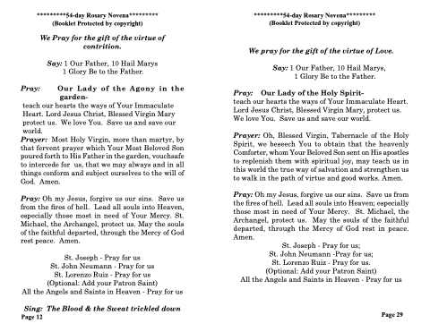 All the Angels and Saints in in in Heaven - Pray for us Sing: The Blood & the Sweat trickled down teach our our hearts the the ways of of Your Immaculate Heart Lord Jesus Christ Blessed Virgin Mary protect us us us We love You Save us us and save our world Prayer: Oh Blessed Virgin Tabernacle of the the Holy Spirit we beseech You You to obtain that the the heavenly Comforter whom Your Beloved Son sent on on His apostles to replenish them with spiritual joy may teach us us in this world the the the the true way of of salvation and and strengthen us us to walk in the the the path of of virtue and and good works Amen Pray: Oh my Jesus forgive us us us our sins Save us us us from the the fires of of hell Lead all all souls into Heaven especially those most in in need of of of Your Mercy St Michael the the the the Archangel protect us May the the the the souls of of of the the the the faithful departed through the the the Mercy of of God rest in peace Amen St Joseph - - Pray Pray for for us St St St John Neumann -Pray for for for us us us St St Lorenzo Ruiz - - Pray Pray for for us us (Optional: Add your Patron Saint)