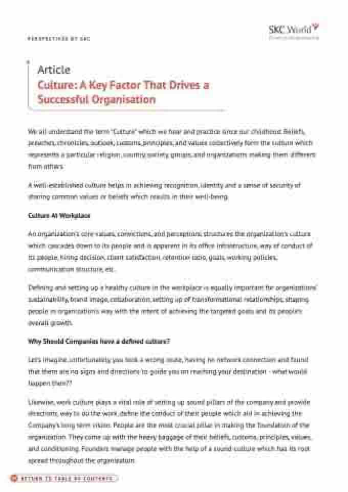 An organization’s core values, convictions, and perceptions structures the organization’s culture which cascades down to its people and is apparent in its office infrastructure, way of conduct of its people, hiring decision, client satisfaction, retention ratio, goals, working policies, communication structure, etc.